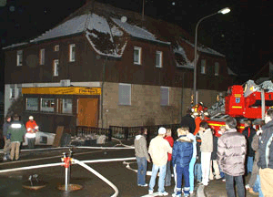 bedrohte Dach. Etwa 50 Schaulustige standen auf der Straße.